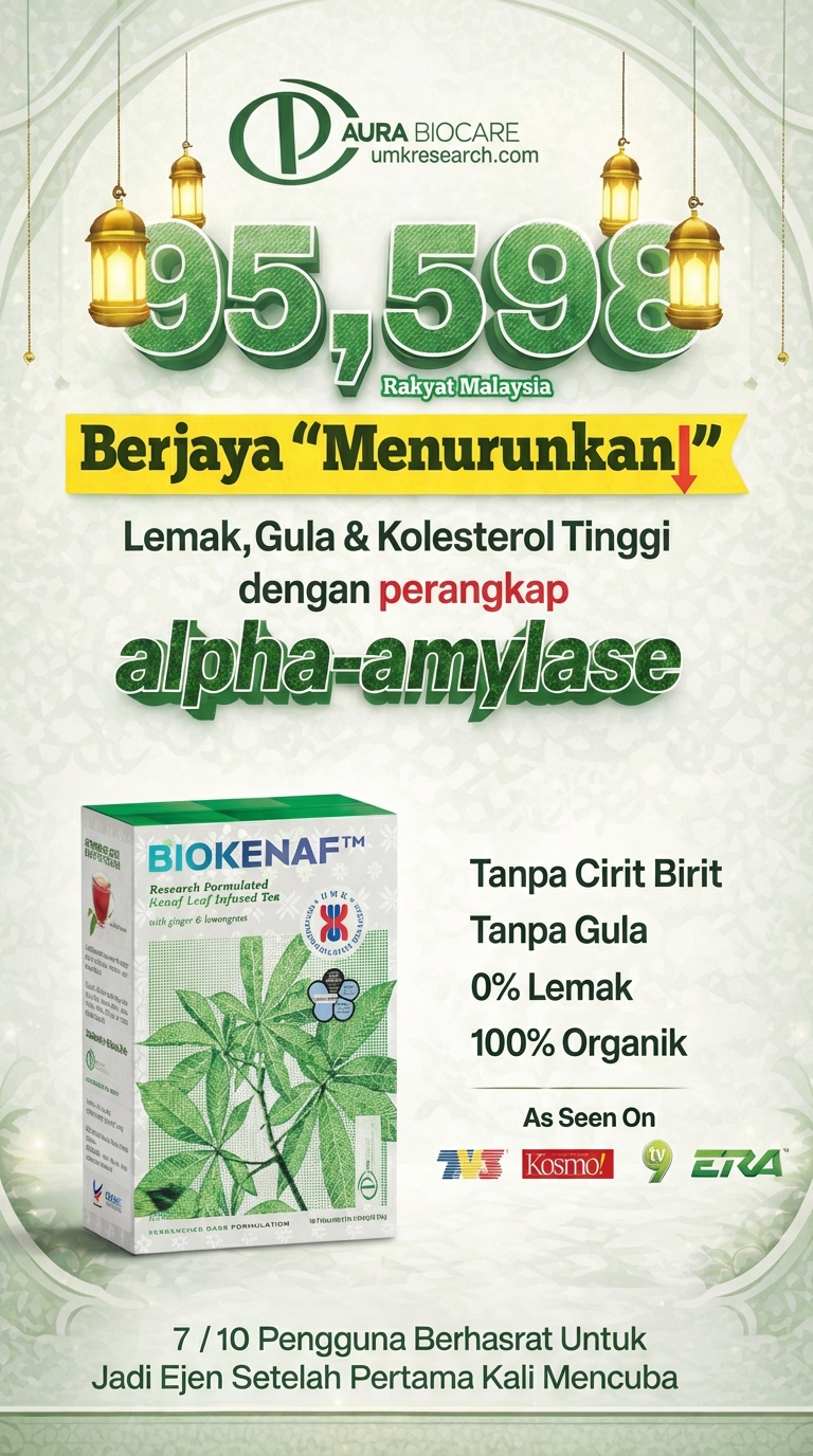 Biokenaf® diformulasi untuk target halang alpha-amylase dari memecahkan karbohidrat kepada gula & hentikan pembentukan lemak & triglycerides di hati.
